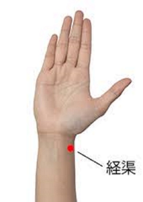 〇経渠(けいきょ):手首のシワ(親指側)から指1本分下。