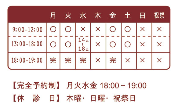 | 13:00-19:00 | ○ | ○ | ○ | × | ○ | ○ | × | × |